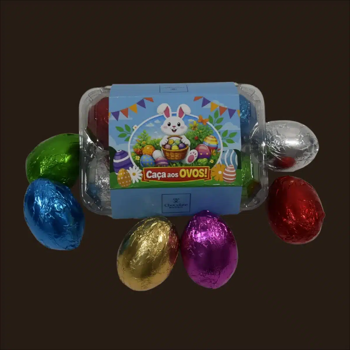 Caixa com 6 mini ovos de chocolate de leite, delicadamente preparados para um momento doce e irresistível.