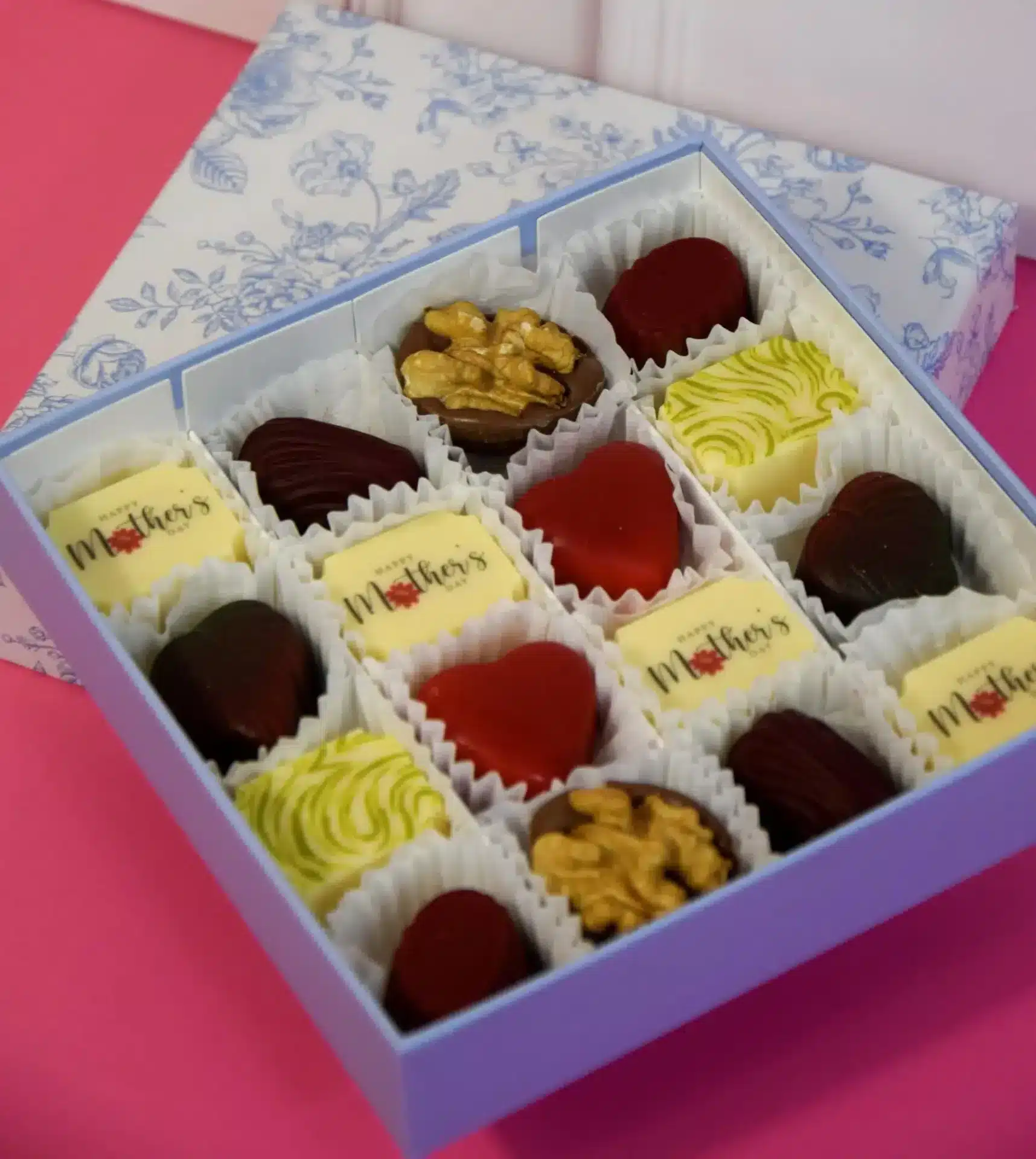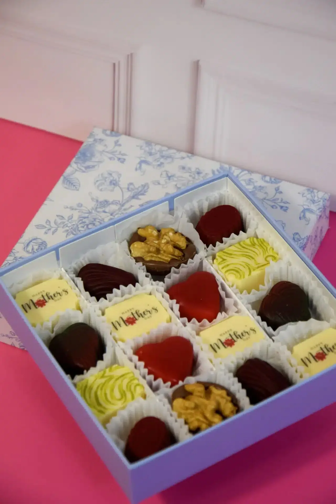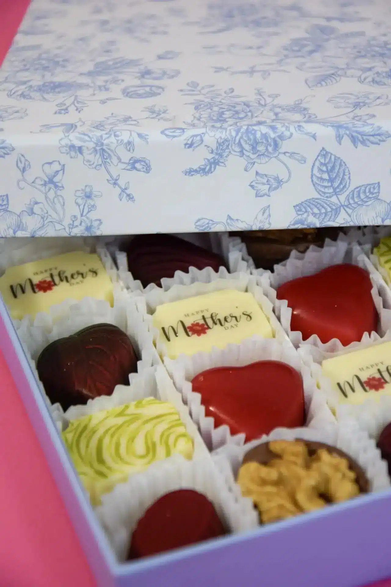 Cobertura 67% – Chocolate negro 39% (Pasta de cacau, açúcar, manteiga de cacau, emulsionante: lecitina de soja, aroma natural de baunilha), Chocolate de leite 19% (açúcar, manteiga de cacau, leite desnatado em pó, pasta de cacau, soro de leite em pó, matéria gorda láctea, leite gordo em pó, emulsionante: lecitina de soja, aroma natural de baunilha, aroma), Chocolate branco 9% (açúcar, manteiga de cacau, leite em pó, soro de leite em pó, emulsionante: lecitina de soja, extrato de baunilha); Recheios sortidos 32% – Pasta de chocolate branco (Gordura vegetal (palmiste, coco, palma), açúcar, leite gordo em pó, chocolate branco 10% (leite gordo em pó, açúcar, manteiga de cacau), leite desnatado em pó, emulsionante: lecitina de soja, aromas), Preparado de Maracujá 3,8% (Xarope de glucose-frutose, água, maracujá (10%), amido modificado, sumo concentrado de maracujá (2,5%), gelificante (pectina), conservante (sorbato de potássio), reguladores de acidez (citrato de sódio, ácido cítrico), aroma, corante (beta-caroteno)), miolo de noz 2,9%, Pasta de frutos vermelhos 1,9% (Frutos do bosque 45% (morango: 9%, framboesa: 9%, mirtilo: 9%, amora: 9%, groselhas: 9%), açúcar, xarope de glucose- frutose; gelificante: pectina (E440i), regulador de acidez: ácido cítrico (E330) e difosfato tetra-sódico (E450iii), conservante: ácido sorbico (E200), aroma), Creme de Avelã 1,9% (Óleo vegetal (girassol, palma), açúcar, avelã, leite desnatado em pó, soro de leite em pó, lactose, emulsionante: lecitina de soja, aroma), Caramelo 1,9% (Caramelo 97% (açúcar, xarope de glucose-frutose e água), amido modificado, espessante: E406, conservante: E202, aromas, acidificante: E330, corante: E120), Pasta de chocolate de leite (Gordura vegetal (palmiste, coco, palma), açúcar, chocolate de leite 18% (leite em pó, cacau, açúcar. Cacau 30% min.), leite em pó, emulsionante: lecitina de soja, aroma), miolo de amêndoa granulada sem pele 1%, Mel 0,8%, Natas (Nata (35% M.G.), emulsionante: E472b e estabilizador: E407), essência baunilha 0,5% (água, álcool neutro, corante natural caramelo e substâncias aromáticas), Sorbitol líquido (E420) (milho, trigo, água), Pasta com sabor a menta 0,4% (Xarope de glucose-frutose, aroma natural de menta, água, corante: E102, E133), Chocolate negro 0,4% (Pasta de cacau, açúcar, manteiga de cacau, emulsionante: lecitina de soja, aroma natural de baunilha), Açúcar invertido (açúcar, água, reguladores de acidez: E330 e E500ii), pasta concentrada de banana 0,3% (Banana 51%, extrato de fruta, açúcar, corretor de acidez: ácido cítrico (E330), agente gelificante: pectina (E440ii), Corante natural: extrato de curcuma, inulina, condimentos, corante: caramelo (E150d), Conservante: sorbato de potássio (E202), Difosfato dissódico (E450), Dextrose, Fosfato tricálcico (E341iii)), pasta concentrada de ananás 0,3% (Ananás, açúcar, extrato de fruta, aroma, espessante: pectina (E440ii), acidificante: ácido cítrico (E330), corantes naturais: curcuma (E100ii) e beta-caroteno (E160a), conservantes: sorbato de potássio (E202) e difosfato dissódico (E450), dextrose e fosfato tricálcico (E341iii)); Corante (Propelentes: Butano E943a, Isobutano E943b, Propano E944; álcool etílico, corantes: E172, E171, E133) e Corante (manteiga de cacau, açúcar, corantes: E171, E172, E129, E104, E132, E122). Pode conter vestígios de sementes de sésamo, ovo, amendoins, nozes e outros frutos de casca rija. Cacau: 64,5% mínimo no chocolate negro. Cacau: 36,5% mínimo no chocolate de leite. Cacau: 30,14% mínimo no chocolate branco