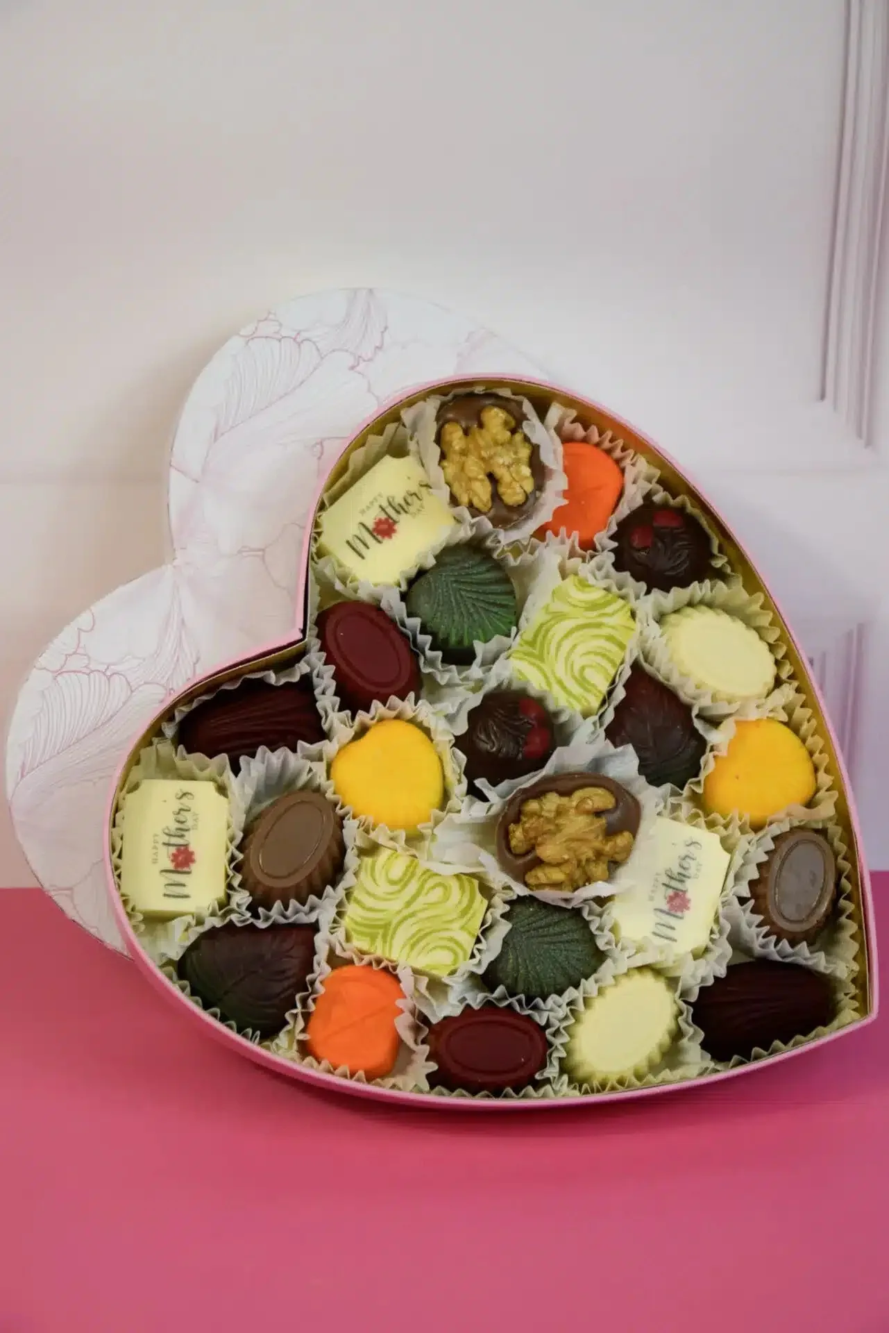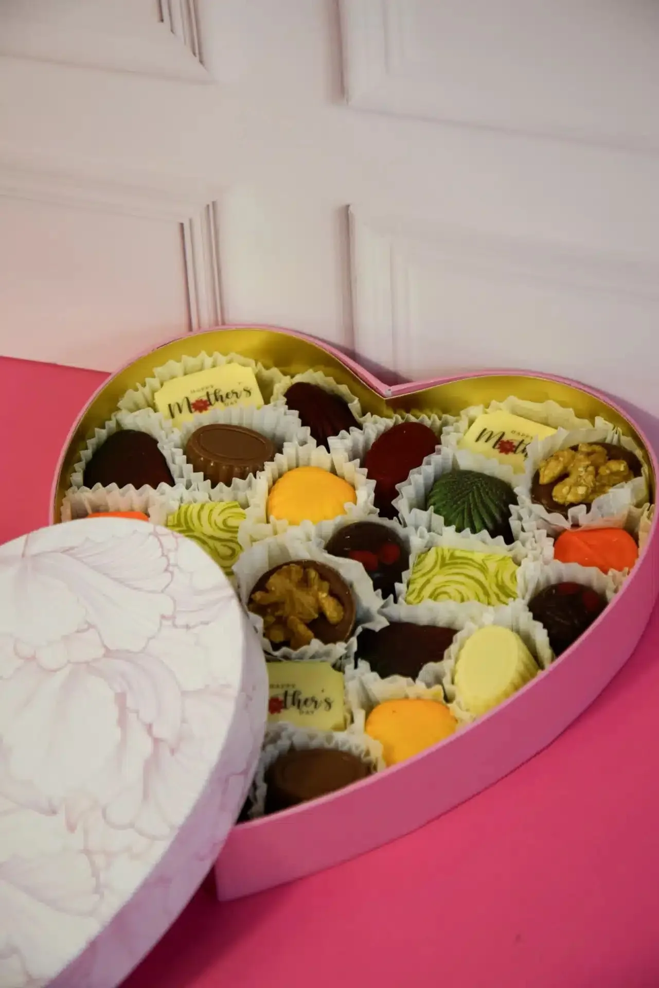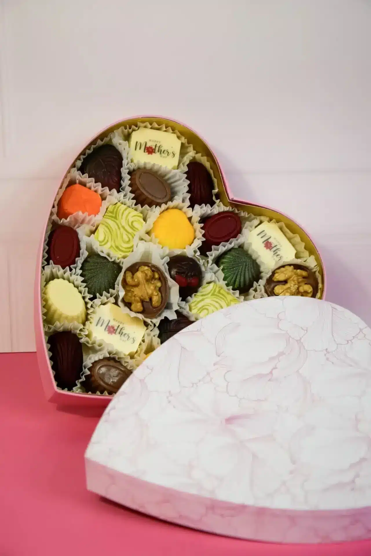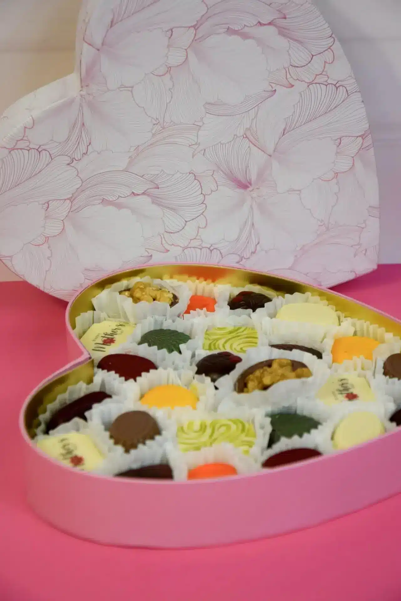 Cobertura 67% – Chocolate negro 39% (Pasta de cacau, açúcar, manteiga de cacau, emulsionante: lecitina de soja, aroma natural de baunilha), Chocolate de leite 19% (açúcar, manteiga de cacau, leite desnatado em pó, pasta de cacau, soro de leite em pó, matéria gorda láctea, leite gordo em pó, emulsionante: lecitina de soja, aroma natural de baunilha, aroma), Chocolate branco 9% (açúcar, manteiga de cacau, leite em pó, soro de leite em pó, emulsionante: lecitina de soja, extrato de baunilha); Recheios sortidos 32% – Pasta de chocolate branco (Gordura vegetal (palmiste, coco, palma), açúcar, leite gordo em pó, chocolate branco 10% (leite gordo em pó, açúcar, manteiga de cacau), leite desnatado em pó, emulsionante: lecitina de soja, aromas), Preparado de Maracujá 3,8% (Xarope de glucose-frutose, água, maracujá (10%), amido modificado, sumo concentrado de maracujá (2,5%), gelificante (pectina), conservante (sorbato de potássio), reguladores de acidez (citrato de sódio, ácido cítrico), aroma, corante (beta-caroteno)), miolo de noz 2,9%, Pasta de frutos vermelhos 1,9% (Frutos do bosque 45% (morango: 9%, framboesa: 9%, mirtilo: 9%, amora: 9%, groselhas: 9%), açúcar, xarope de glucose- frutose; gelificante: pectina (E440i), regulador de acidez: ácido cítrico (E330) e difosfato tetra-sódico (E450iii), conservante: ácido sorbico (E200), aroma), Creme de Avelã 1,9% (Óleo vegetal (girassol, palma), açúcar, avelã, leite desnatado em pó, soro de leite em pó, lactose, emulsionante: lecitina de soja, aroma), Caramelo 1,9% (Caramelo 97% (açúcar, xarope de glucose-frutose e água), amido modificado, espessante: E406, conservante: E202, aromas, acidificante: E330, corante: E120), Pasta de chocolate de leite (Gordura vegetal (palmiste, coco, palma), açúcar, chocolate de leite 18% (leite em pó, cacau, açúcar. Cacau 30% min.), leite em pó, emulsionante: lecitina de soja, aroma), miolo de amêndoa granulada sem pele 1%, Mel 0,8%, Natas (Nata (35% M.G.), emulsionante: E472b e estabilizador: E407), essência baunilha 0,5% (água, álcool neutro, corante natural caramelo e substâncias aromáticas), Sorbitol líquido (E420) (milho, trigo, água), Pasta com sabor a menta 0,4% (Xarope de glucose-frutose, aroma natural de menta, água, corante: E102, E133), Chocolate negro 0,4% (Pasta de cacau, açúcar, manteiga de cacau, emulsionante: lecitina de soja, aroma natural de baunilha), Açúcar invertido (açúcar, água, reguladores de acidez: E330 e E500ii), pasta concentrada de banana 0,3% (Banana 51%, extrato de fruta, açúcar, corretor de acidez: ácido cítrico (E330), agente gelificante: pectina (E440ii), Corante natural: extrato de curcuma, inulina, condimentos, corante: caramelo (E150d), Conservante: sorbato de potássio (E202), Difosfato dissódico (E450), Dextrose, Fosfato tricálcico (E341iii)), pasta concentrada de ananás 0,3% (Ananás, açúcar, extrato de fruta, aroma, espessante: pectina (E440ii), acidificante: ácido cítrico (E330), corantes naturais: curcuma (E100ii) e beta-caroteno (E160a), conservantes: sorbato de potássio (E202) e difosfato dissódico (E450), dextrose e fosfato tricálcico (E341iii)); Corante (Propelentes: Butano E943a, Isobutano E943b, Propano E944; álcool etílico, corantes: E172, E171, E133) e Corante (manteiga de cacau, açúcar, corantes: E171, E172, E129, E104, E132, E122). Pode conter vestígios de sementes de sésamo, ovo, amendoins, nozes e outros frutos de casca rija. Cacau: 64,5% mínimo no chocolate negro. Cacau: 36,5% mínimo no chocolate de leite. Cacau: 30,14% mínimo no chocolate branco