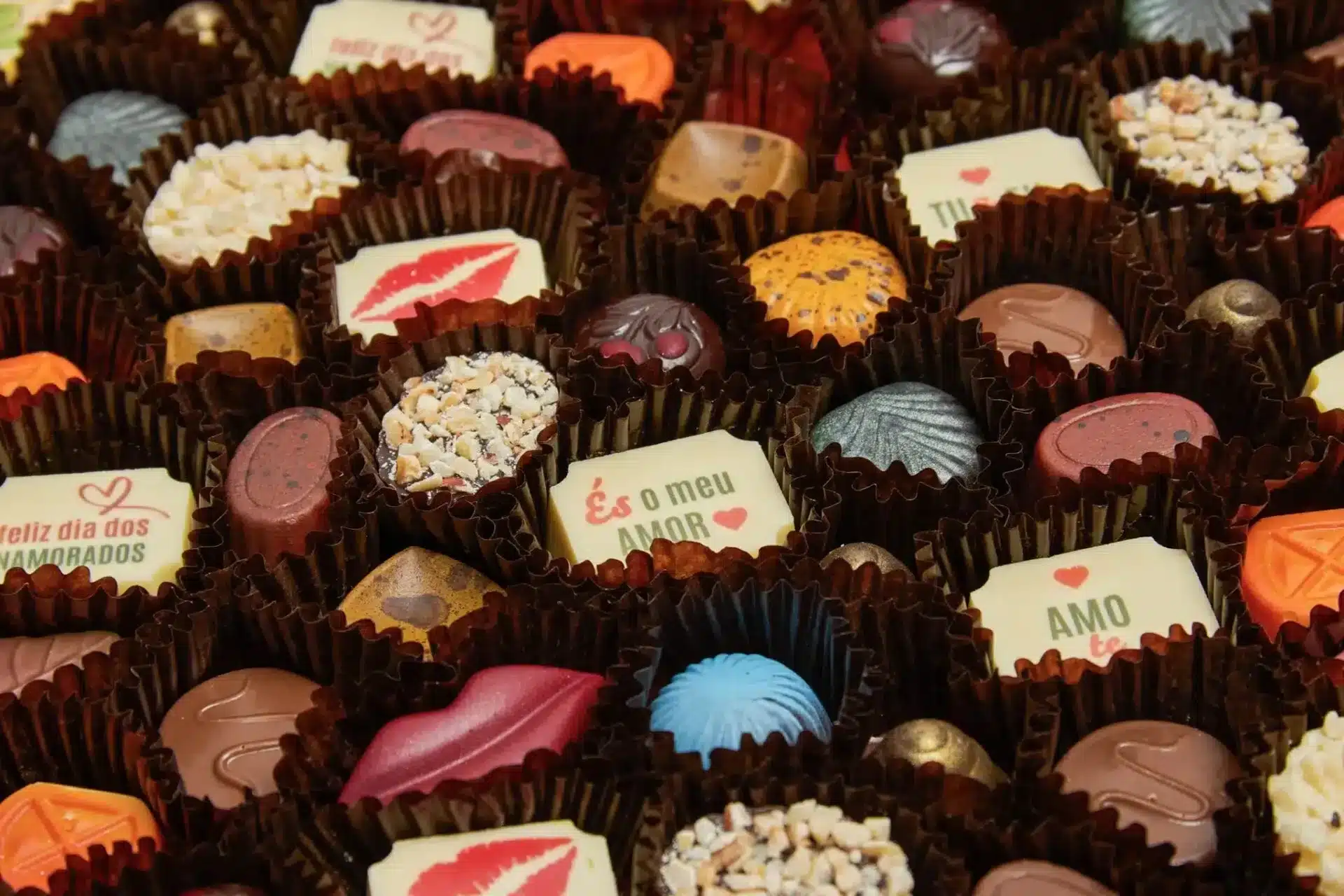 Ingredientes: Cobertura 58,9% – Chocolate negro 23,6% (pasta de cacau, açúcar, manteiga de cacau, emulsionante: lecitina de soja, aroma natural de baunilha), Chocolate branco 18,1% (açúcar, manteiga de cacau, leite em pó, soro de leite em pó, emulsionante: lecitina de soja, extrato de baunilha) e Chocolate de leite 17,2% (açúcar, manteiga de cacau, leite desnatado em pó, pasta de cacau, soro de leite em pó, matéria gorda láctea, leite gordo em pó, emulsionante: lecitina de soja, aroma natural de baunilha, aroma); Recheios sortidos 39,4% – Pasta de chocolate branco 13,3% (Gordura vegetal (palmiste, coco, palma), açúcar, leite gordo em pó, chocolate branco 10% (leite gordo em pó, açúcar, manteiga de cacau), leite desnatado em pó, emulsionante: lecitina de soja, aromas), Pasta de chocolate de leite 4,5% (Gordura vegetal (palmiste, coco, palma), açúcar, chocolate de leite 18% (leite em pó, cacau, açúcar. Cacau 30% min.), leite em pó, emulsionante: lecitina de soja, aroma), pasta de chocolate 2,8% (Gordura vegetal (palmiste, coco, palma), chocolate em pó 25% (açúcar, cacau 35% min.), açúcar, cacau magro em pó, leite desnatado em pó, soro de leite em pó, emulsionante: lecitina de soja, aromas), Pasta de chocolate branco crocante 2,3% (Chocolate branco 38% (leite em pó, açúcar, soro de leite em pó, manteiga de cacau, manteiga concentrada, emulsionante (lecitina de soja), extrato natural de baunilha), biscoito finamente esfarelado 24% (farinha de trigo, açúcar, manteiga concentrada, leite desnatado em pó, farinha de malte de cevada, sal), óleo vegetal (coco, girassol, palma, palmiste), açúcar), caramelo 1,9% (Caramelo 97% (açúcar, xarope de glucose-frutose e água), amido modificado, espessante: E406, conservante: E202, aromas, acidificante: E330, corante: E120), chocolate branco 1,4% (açúcar, manteiga de cacau, leite em pó, soro de leite em pó, emulsionante: lecitina de soja, extrato de baunilha), Preparado de Maracujá 1,3% (Xarope de glucose-frutose, água, maracujá (10%), amido modificado, sumo concentrado de maracujá (2,5%), gelificante (pectina), conservante (sorbato de potássio), reguladores de acidez (citrato de sódio, ácido cítrico), aroma, corante (beta-caroteno)), Pasta de frutos vermelhos 1,3% (Frutos do bosque 45% (morango: 9%, framboesa: 9%, mirtilo: 9%, amora: 9%, groselhas: 9%), açúcar, xarope de glucose- frutose; gelificante: pectina (E440i), regulador de acidez: ácido cítrico (E330) e difosfato tetrasodico (E450iii), conservante: ácido sorbico (E200), aroma), Guianduia 1% (açúcar, óleo vegetal (girassol e palma), cacau magro 10-12% de manteiga de cacau (11%), avelã (11%), lactose, leite desnatado em pó, soro de leite em pó, emulsionante: lecitina de soja, aroma), Recheio de morango 1% (Morango (45%), açúcar, xarope de glucose-frutose, agente gelificante: pectina (E440i), corrector de acidez: ácido cítrico (E330) e difosfato tetra-sódico (E450iii), conservante: acido sorbico (E200), aroma), Natas (Nata (35% M.G.), emulsionante: E472b e estabilizador: E407), Pasta crocante de chocolate branco com frutos vermelhos 0,8% (Chocolate branco 28% (leite em pó, açúcar, manteiga de cacau, emulsionante: lecitina de soja, aroma natural de baunilha), óleo vegetal (palma, girassol, palmiste, coco), açúcar, crepe finamente desintegrado 15% (farinha trigo, açúcar, manteiga concentrada, leite desnatado em pó, farinha de malte de cevada, sal), soro de leite em pó, frutas vermelhas desidratadas (framboesa 2,8%, morango 1%), manteiga concentrada, amido de milho, xarope de glucose desidratado, acidificante: ácido cítrico, corante: carmim e aroma), chocolate de leite 0,8% (açúcar, manteiga de cacau, leite desnatado em pó, pasta de cacau, soro de leite em pó, matéria gorda láctea, leite gordo em pó, emulsionante (lecitina de soja), aroma natural de baunilha, aroma), Licor de Ginja 0,7% (água, açúcar, álcool, aromas, Corante: E150b, Espessante: E466 e Regulador de Acidez: E330)), Creme de Avelã 0,6% (Óleo vegetal (girassol, palma), açúcar, avelã, leite desnatado em pó, soro de leite em pó, lactose, emulsionante: lecitina de soja, aroma), Pasta de chocolate de leite e flocos de coco com crocante de manteiga 0,6% (Chocolate de leite 22% (açúcar, leite em pó, manteiga de cacau, cacau magro, emulsionante: lecitina de soja), açúcar, óleo vegetal (girassol, palmiste, coco, palma), biscoito finamente esfarelado 14% (farinha de trigo, açúcar, manteiga concentrada, leite desnatado em pó, farinha de malte de cevada, sal), soro de leite em pó, flocos de coco, manteiga concentrada, emulsionante: lecitina de soja e aroma), Cereais com mel 0,6% (Farinha de trigo e trigo hidrolisado (76,1%), sacarose, mel (6%), inulina, regulador de acidez (carbonato de cálcio), ferro reduzido, aromatizante (vanilina), vitaminas (C, tiamina, riboflavina, niacina, B6, ácido fólico, B12, ácido pantoténico)), vinho Cruz Pink 0,5% (sulfitos), Geleia de Limão 0,5% (Xarope de glucose-frutose, açúcar, água, pasta de limão cristalizada a 5% (açúcar, casca de limão cristalizada, sumo de limão, óleo), sumo de limão, gelificante: pectina (E 440), amido modificado, acidificante: regulador de acidez (E330 e E331), estabilizador: cloreto de cálcio (E509), extratos vegetais (espirulina e açafrão), corantes: E160a – E100, aromatizante, conservante de sorbato de potássio (E202)), Praliné flor de sal 0,3% (Chocolate branco 28% (leite em pó, açúcar, manteiga de cacau, emulsionante: lecitina de soja, aroma natural de baunilha), biscoito finamente desintegrado 21.4% (farinha de trigo, açúcar, manteiga concentrada, leite desnatado em pó, farinha de malte de cevada, sal), óleo vegetal (palma, girassol, palmiste, coco), açúcar, soro de leite em pó,amêndoa, manteiga concentrada, caramelo, flor de sal, emulsionante: lecitina de soja, sal e aroma), vinho do Moscatel 0,3% (sulfitos), Sorbitol líquido (E420) (milh