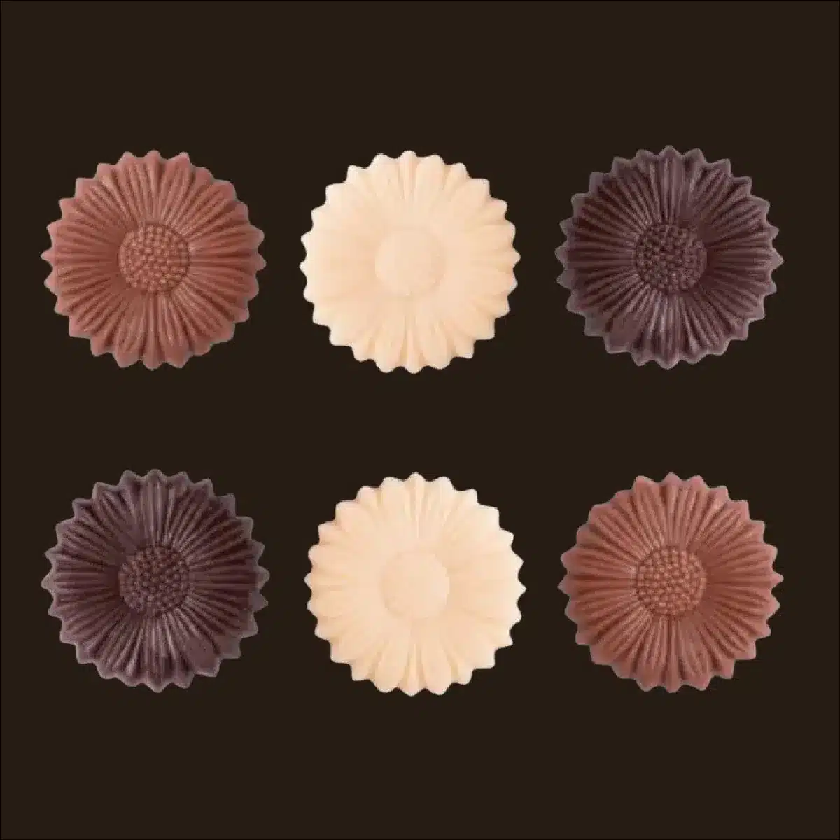 Ingredientes: Chocolate negro (Pasta de cacau, açúcar, manteiga de cacau, emulsionante: lecitina de SOJA, aroma natural de baunilha), Chocolate de LEITE (Açúcar, manteiga de cacau, LEITE desnatado em pó, pasta de cacau, soro de LEITE em pó, matéria gorda LÁCTEA, LEITE gordo em pó, emulsionante: lecitina de SOJA, aroma natural de baunilha, aroma) e Chocolate branco (Açúcar, manteiga de cacau, LEITE em pó, soro de LEITE em pó, emulsionante: lecitina de SOJA, extrato de baunilha).