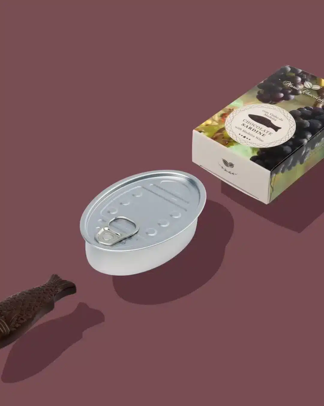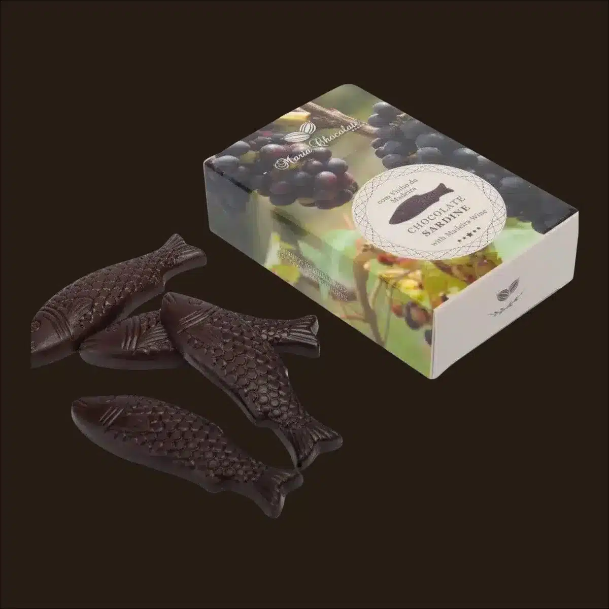 Lata de sardinha de chocolate negro com recheio de vinho da Madeira, em lata original de conserva. Tradição combinada com o delicioso sabor Português.
