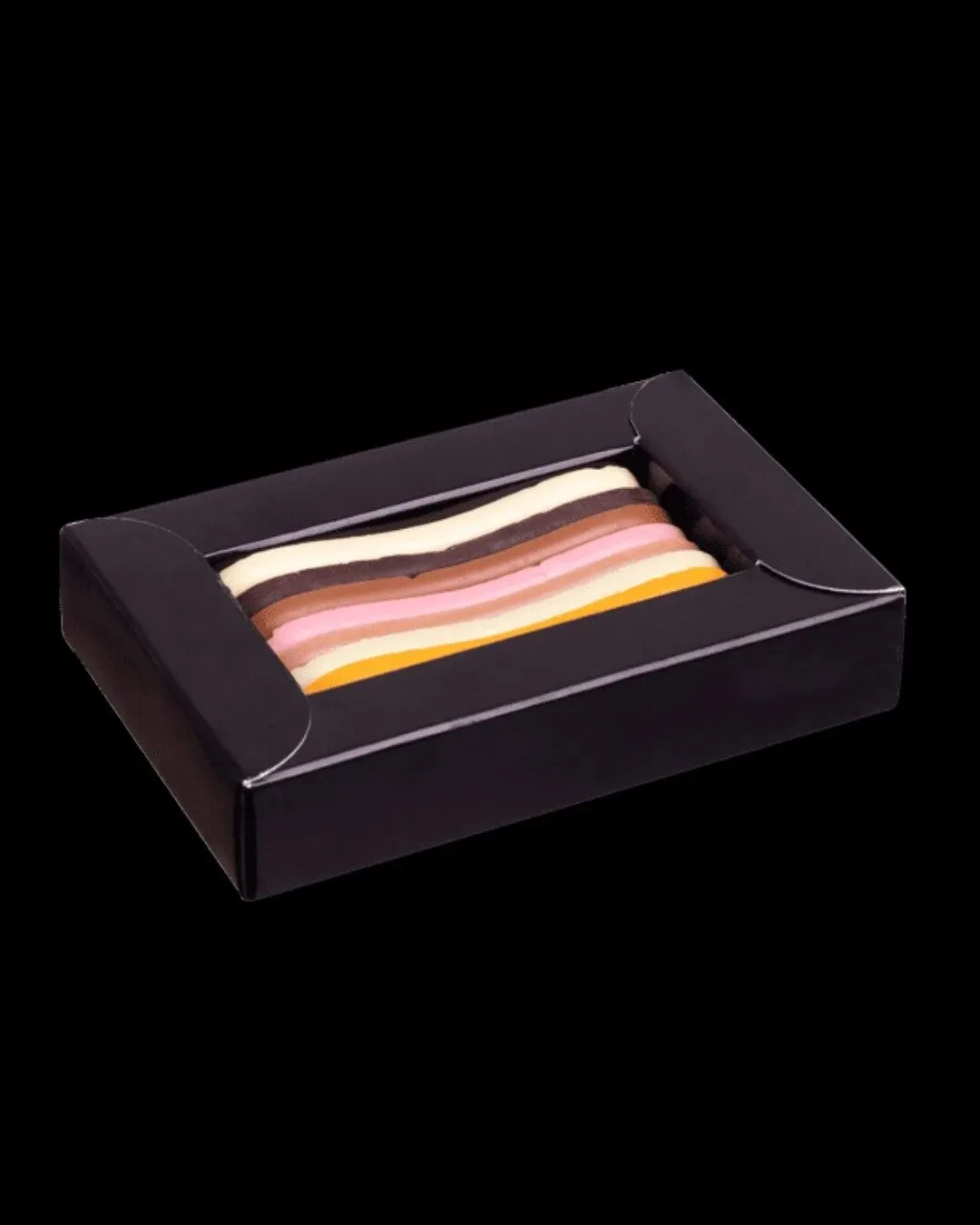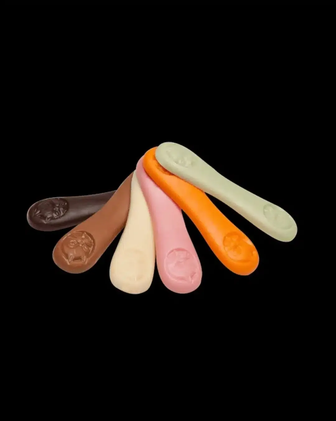 Ingredientes: Chocolate negro 14% (pasta de cacau, açúcar, manteiga de cacau, emulsionante: lecitina de soja, aroma natural de baunilha), Chocolate de leite 14% (açúcar, manteiga de cacau, leite desnatado em pó, pasta de cacau, soro de leite em pó, matéria gorda láctea, leite gordo em pó, emulsionante: lecitina de soja, aroma natural de baunilha, aroma), Chocolate branco 14% (Açúcar, manteiga de cacau, leite em pó, soro de leite em pó, emulsionante: lecitina de soja, extrato de baunilha), Chocolate sabor Morango 14% (Açúcar, manteiga de cacau 30%, leite gordo em pó, emulsionante: lecitina de soja, aroma, corante: E120, aroma natural de baunilha), Chocolate sabor Limão 14% (Açúcar, manteiga de cacau 27,5%, leite gordo em pó, emulsionante: lecitina de soja, aroma natural de limão, corantes: E132, E100, aroma natural de baunilha), Chocolate sabor Laranja 14% (Açúcar, manteiga de cacau 29%, leite gordo em pó, emulsionante: lecitina de soja, aroma natural de laranja, corante: E160e, aroma natural de baunilha), Chocolate sabor Caramelo 14% (Açúcar, manteiga de cacau, leite gordo em pó, pasta de cacau, leite magro em pó, açúcar caramelizado 1,5%, emulsionante: lecitina de soja, aroma, especiarias, extrato de paprika, aroma natural de baunilha).