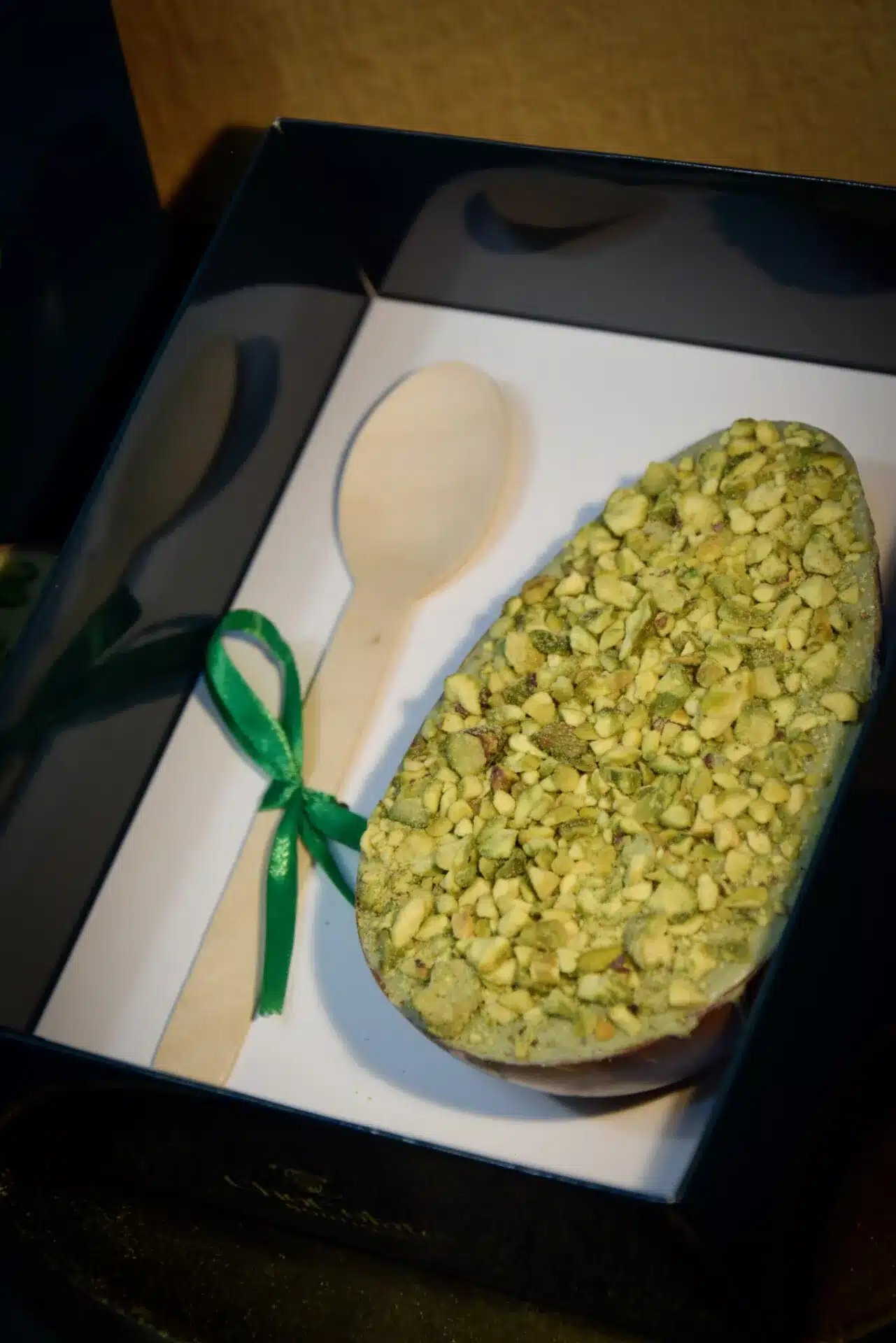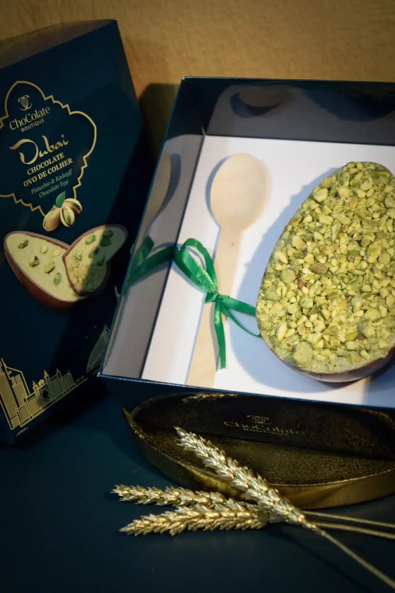 Recheio de Pistachio 60% (leite condensado (LEITE, açúcar e LACTOSE), natas (NATA (35% M.G.), emulsionante: E 472b e estabilizador: E 407), chocolate em pó (açúcar, cacau magro, emulsionante: lecitina de SOJA, sal, vitaminas (vitamina C, vitamina E, niacina, ácido pantoténico, vitamina B1 (tiamina), vitamina B6, ácido fólico)) e manteiga sem sal (NATA pasteurizada e FERMENTOS LÁCTEOS)), PISTACHIOS torrados (15%), LEITE desnatado em pó, soro de LEITE, lactose de LEITE, corante (antocianinas, curcuma), emulsionantes (E322 lecitina girassol) e aromas naturais), chocolate de LEITE (açúcar, manteiga de cacau, leite inteiro em pó, pasta de cacau, soro de LEITE em pó, emulsionante (E322, lecitina de girassol) e aroma natural baunilha), Kadayif (arroz, água).