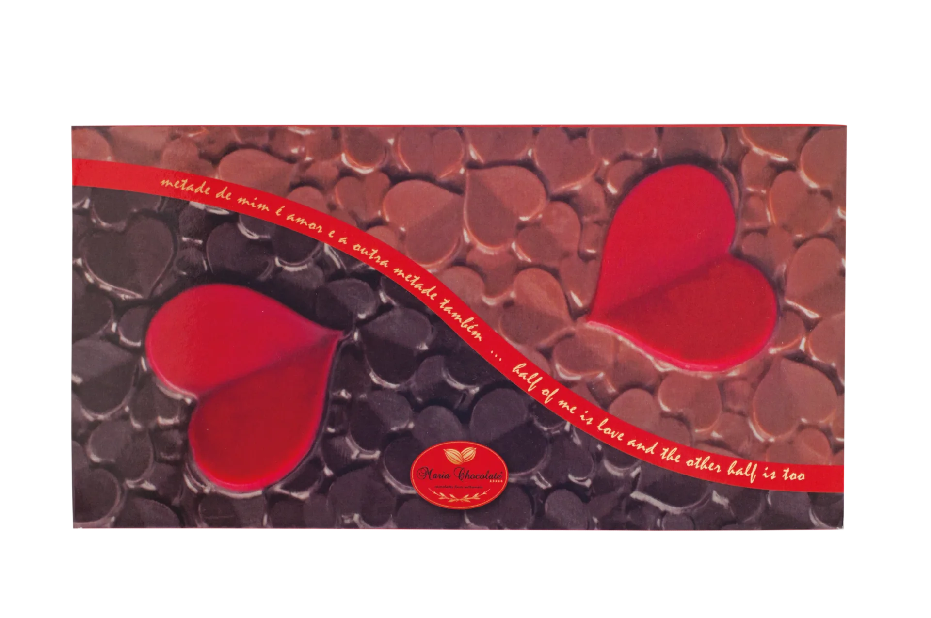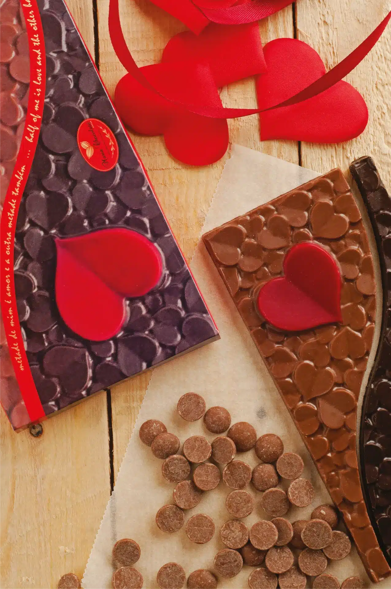 Chocolate de leite 50% (açúcar, manteiga de cacau, leite desnatado em pó, pasta de cacau, soro de leite em pó, matéria gorda láctea, leite gordo em pó, emulsionante (lecitina de soja), aroma natural de baunilha, aroma), Chocolate negro 50% (pasta de cacau, açúcar, manteiga de cacau, emulsionante (lecitina de soja), aroma natural de baunilha, aroma) e corante alimentar E124.