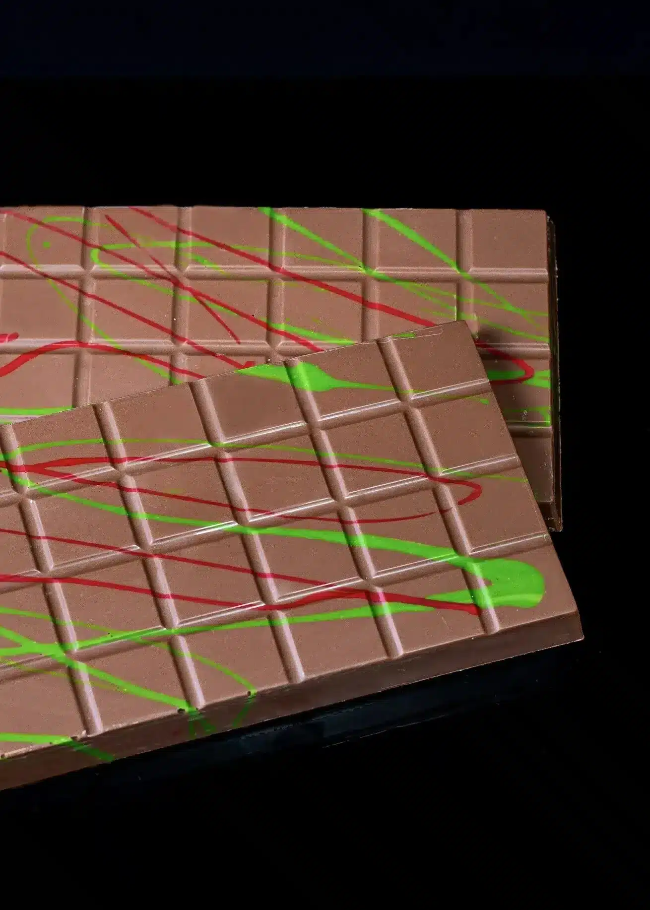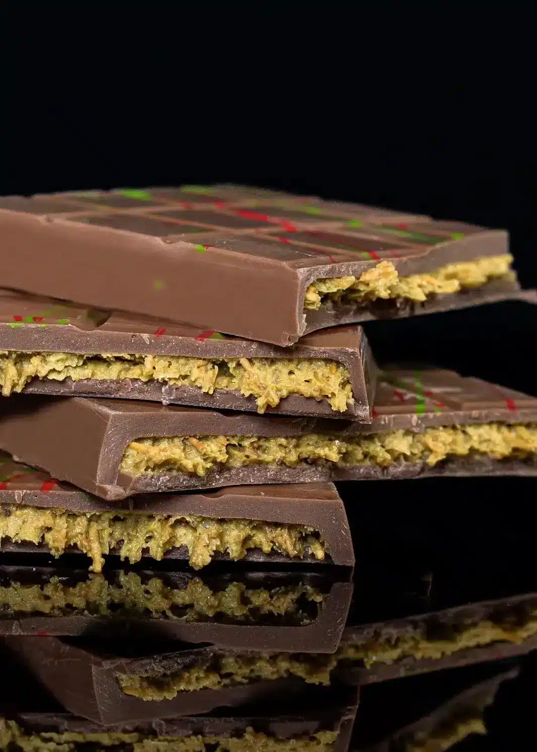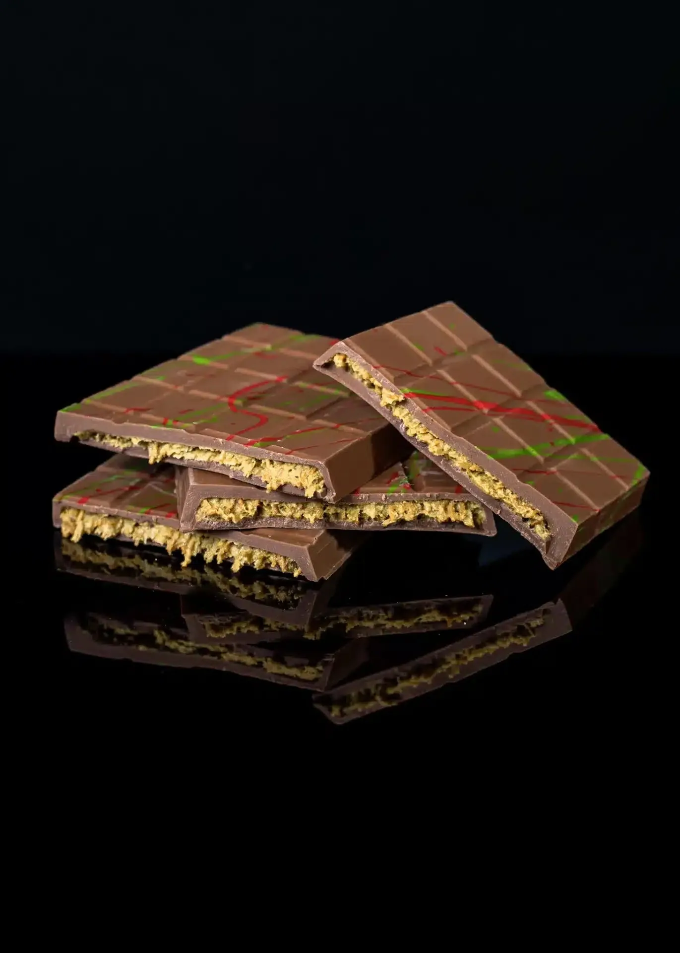 Ingredientes: Recheio PISTACHIO (açúcar, óleo vegetal girassol, gordura palma, PISTACHIOS torrados (15%), LEITE desnatado em pó, soro de leite, LACTOSE, corante (antocianinas, curcuma), emulsionantes (E322 lecitina girassol) e aromas naturais), chocolate de LEITE (açúcar, manteiga de cacau, LEITE inteiro em pó, pasta de cacau, soro de LEITE em pó, emulsionante (E322 lecitina de girassol) e aroma natural baunilha), Kadayif ( 90% arroz, água).