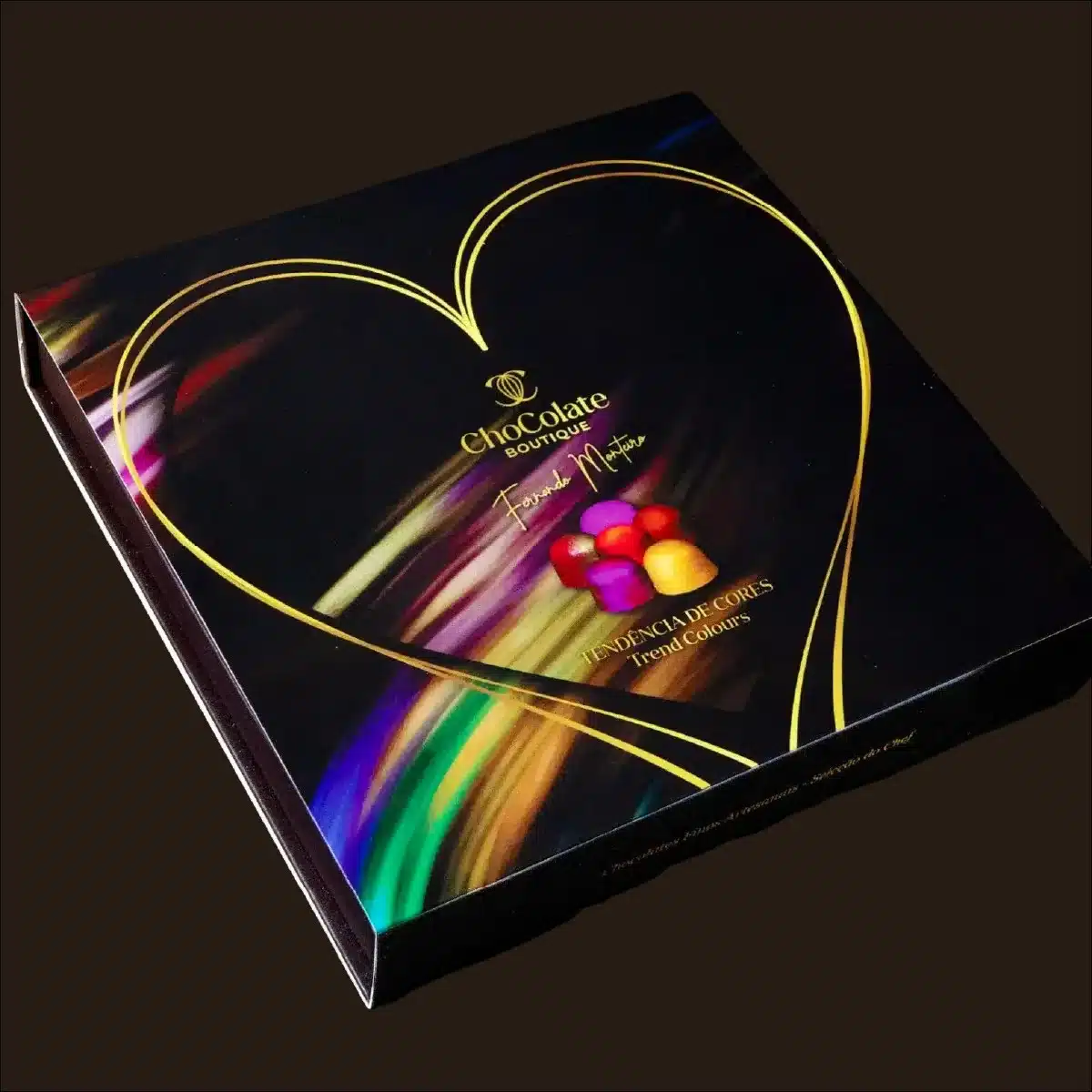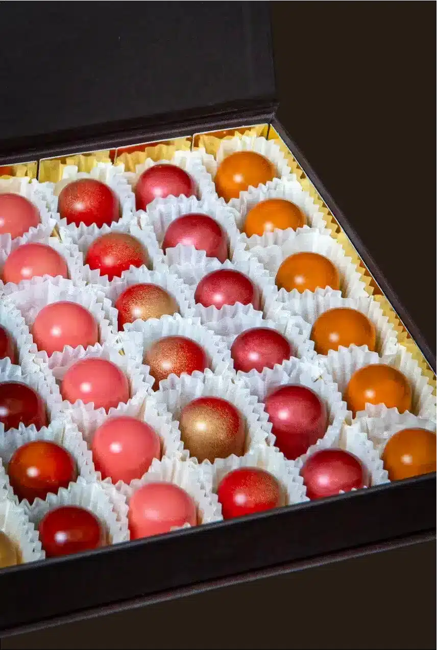 Bombons selecionados e pintados à mão. Uma deliciosa obra de arte. Combinação dos nossos clássicos branco, negro e leite com recheios de Café, grué de cacau, pistachio crocante, creme de avelã com tãmara, caramelo salgado e tropical.